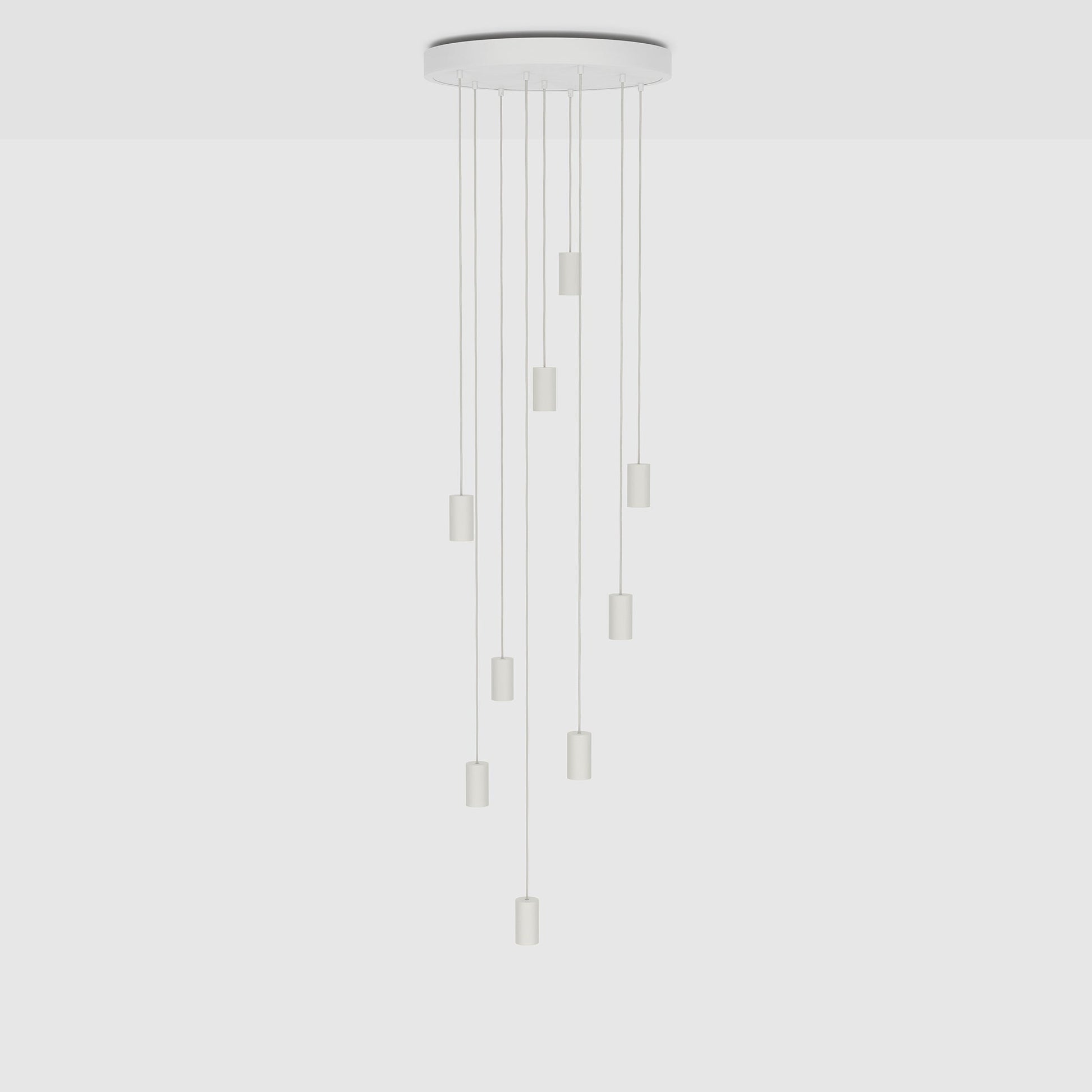 The fixture comes pre-packed with 9 pendants, each with 5 metres of cable. Bulbs not included.