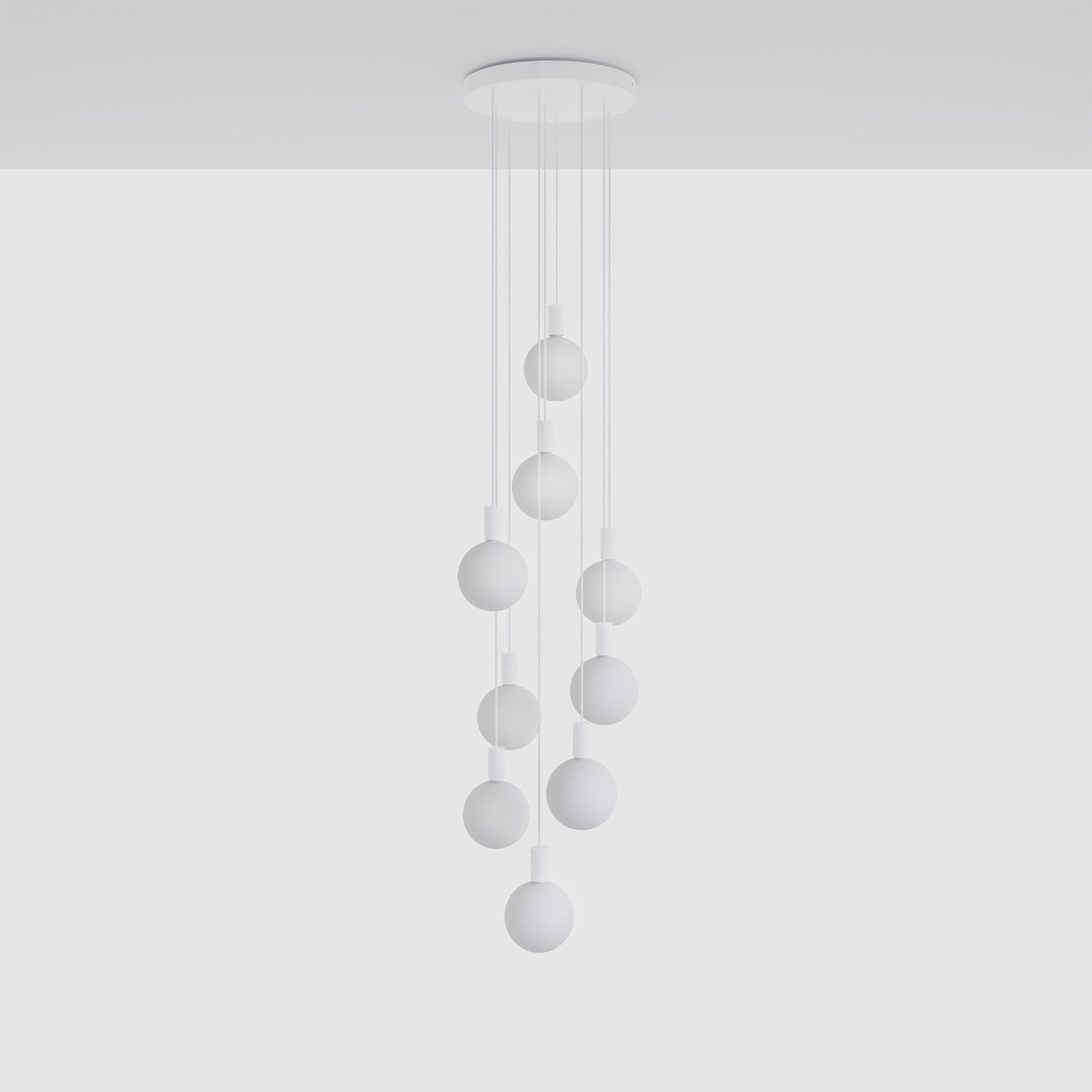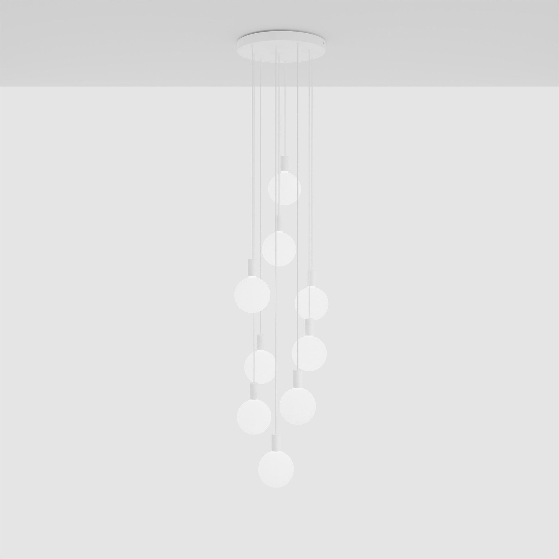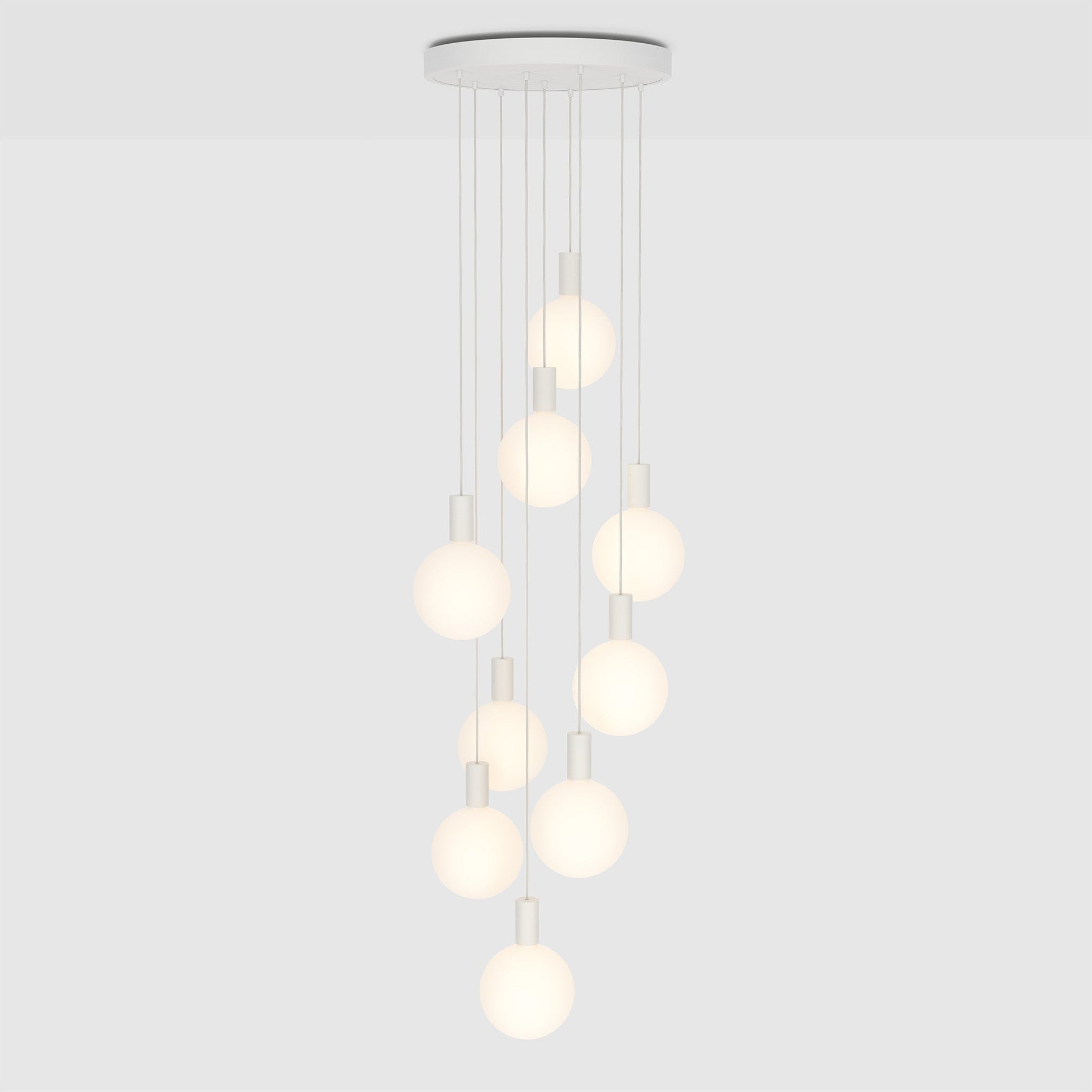 Framed in a large circular canopy that mirrors the textured, dusky-white Chalk finish of the pendants, the concealed neck on the pendants create a subtle harmony between the Sphere V bulbs and fixture.
